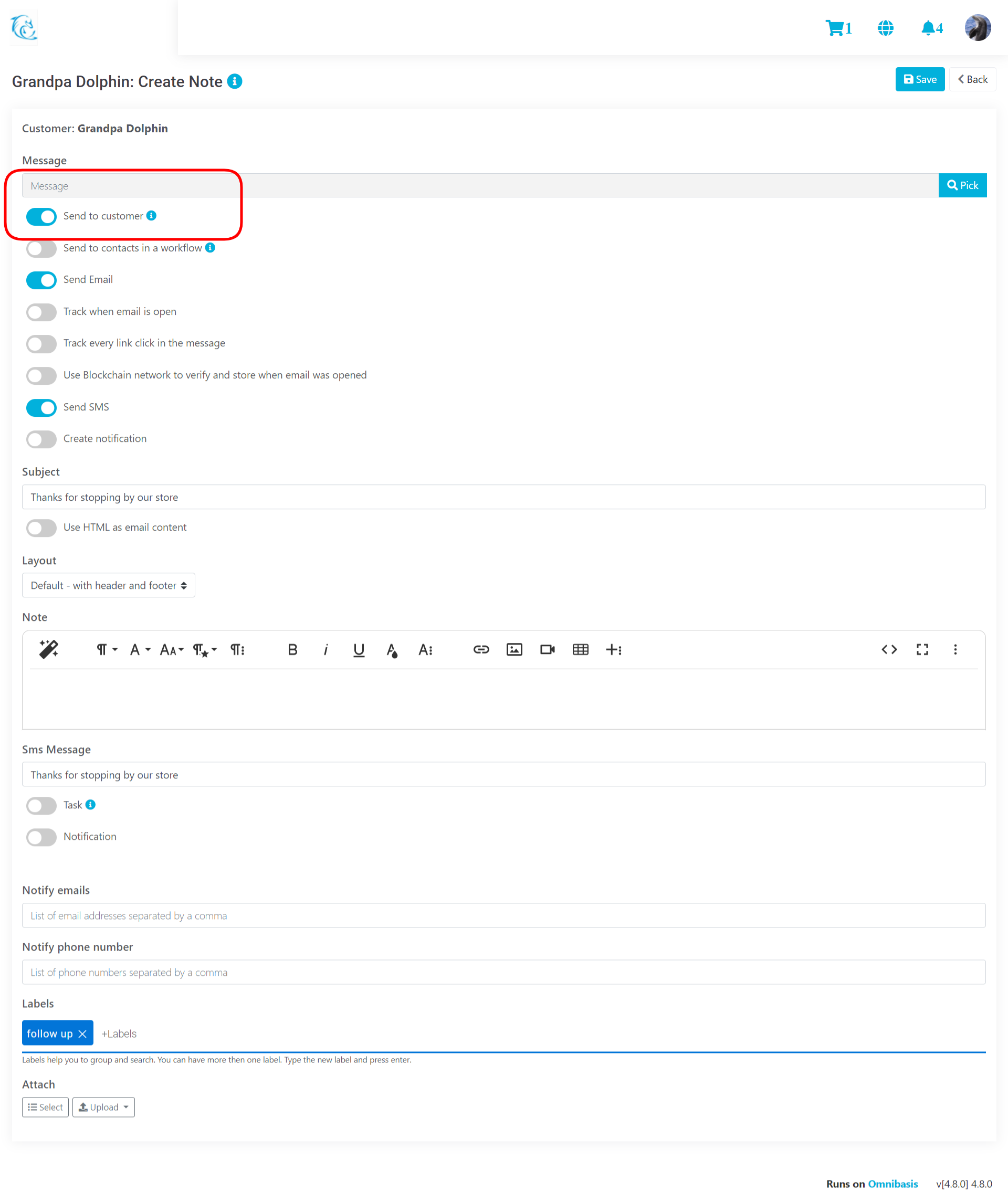 If you want a message to be sent to a customer or user with a note content, you need to turn the option Send to customer.
